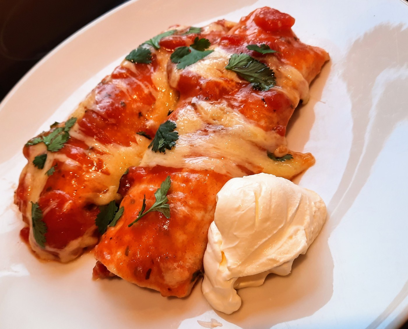 This dish is super easy to make in advance in batches and freeze for convenience. Make the enchilada sauce, and the chicken filling. Freeze separately.