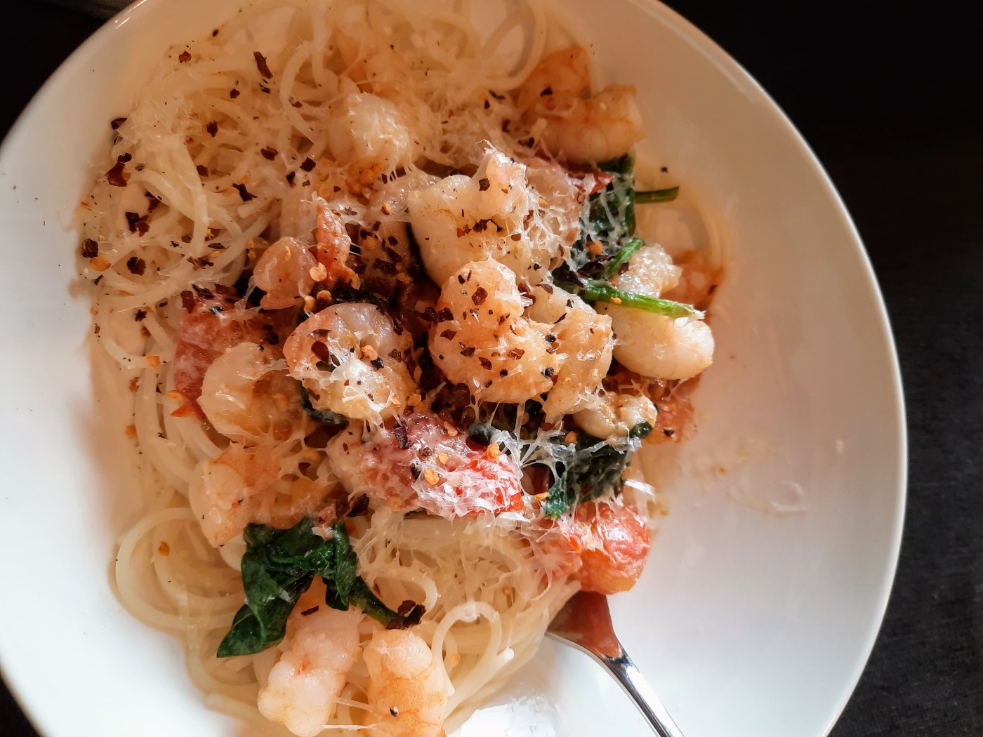 - Add cooked, drain pasta to serving bowls, and top with the cooked ingredients from the pan.