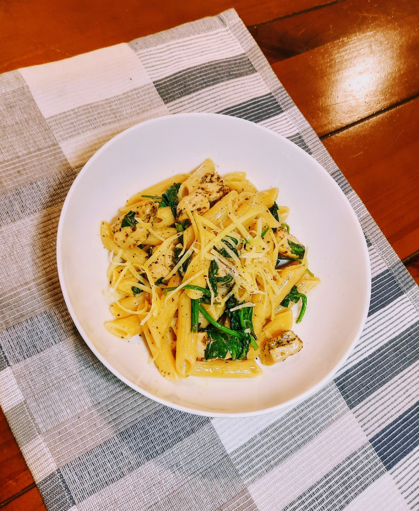 - Add the pasta to the pan and stir through the creamy chicken mixture.