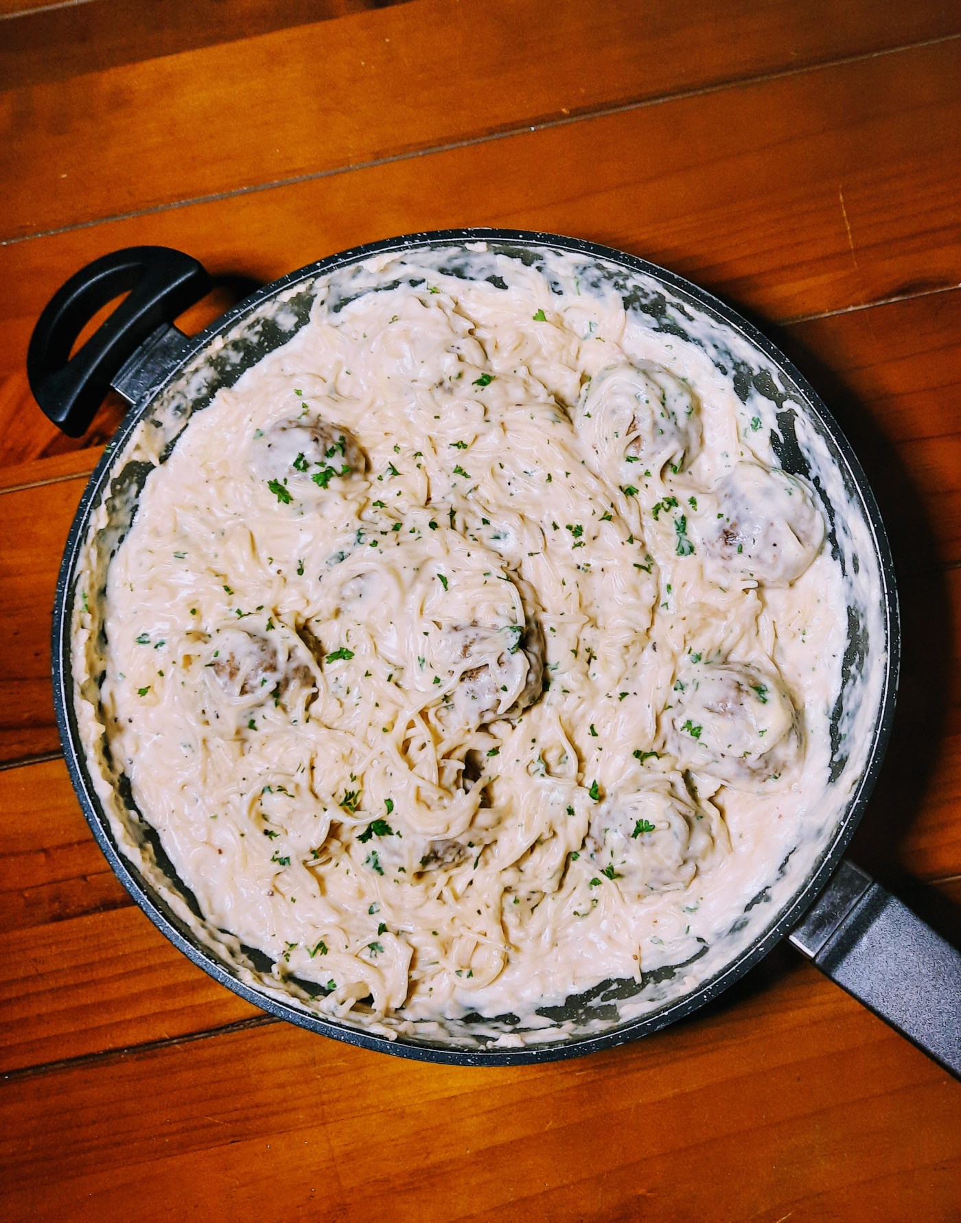 - Flip the meatballs, then add 3 C of water, beef stock powder, milk, remaining salt and pepper, and the soy sauce. Stir well.