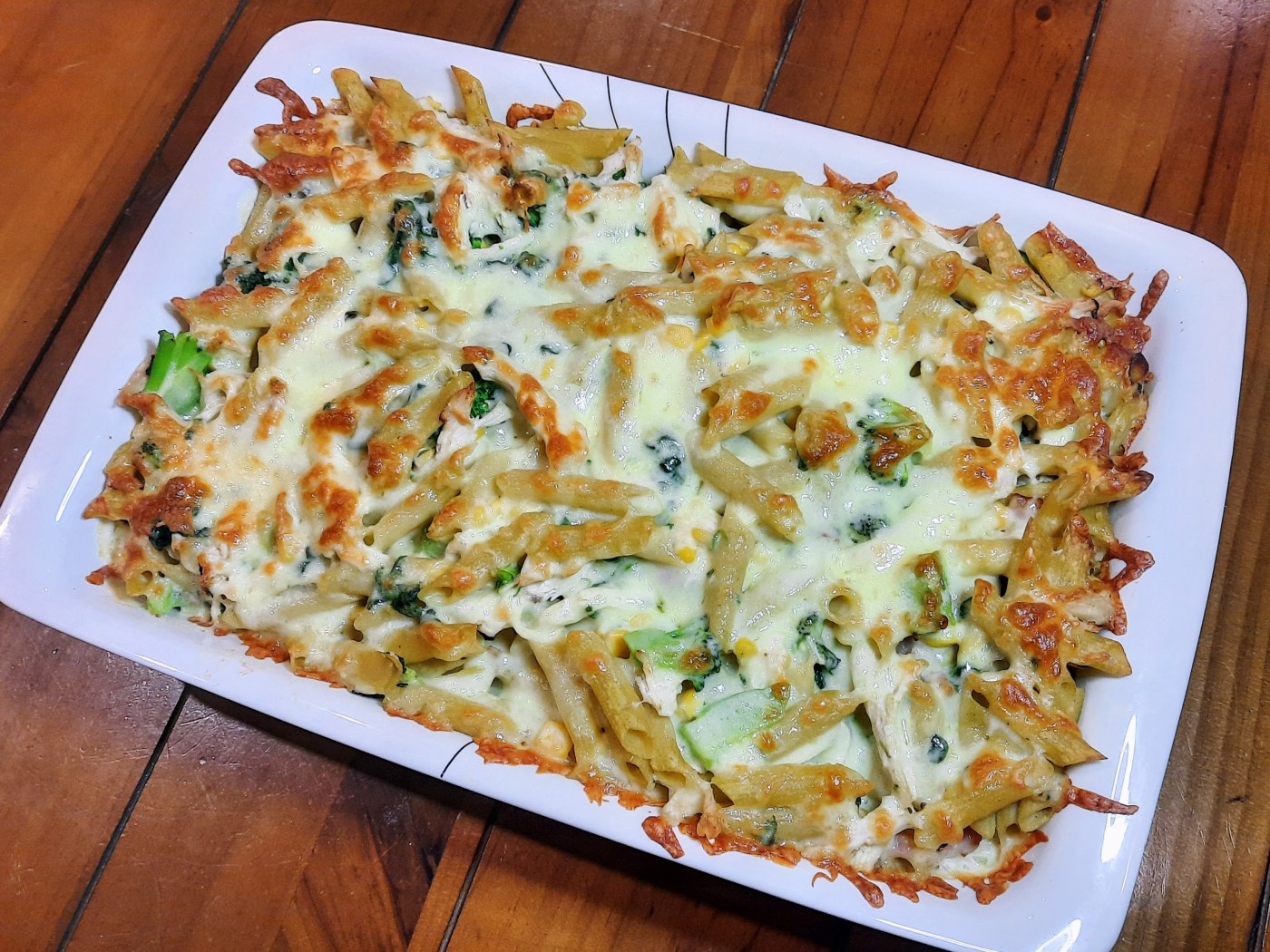 - Add the bacon and the oil from the pan into a bowl, along with the drained pasta, cream, chicken stock powder, corn kernels, spinach, broccoli, and bacon. Add salt and pepper to taste.