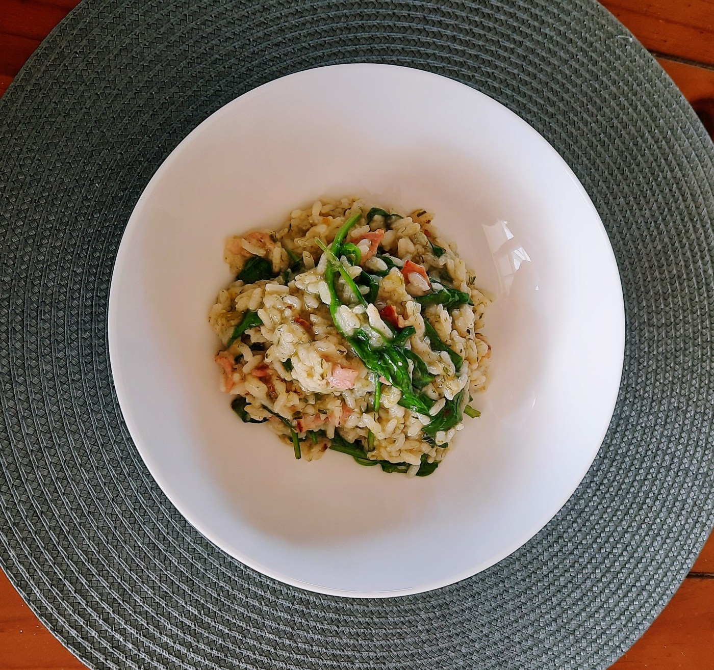 - Add the baby spinach, 1 Tbsp of truffle oil, salt, and pepper and fold through.