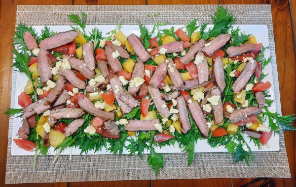 - Add the steak cubes onto the wooden sticks, about 6 pieces per stick.