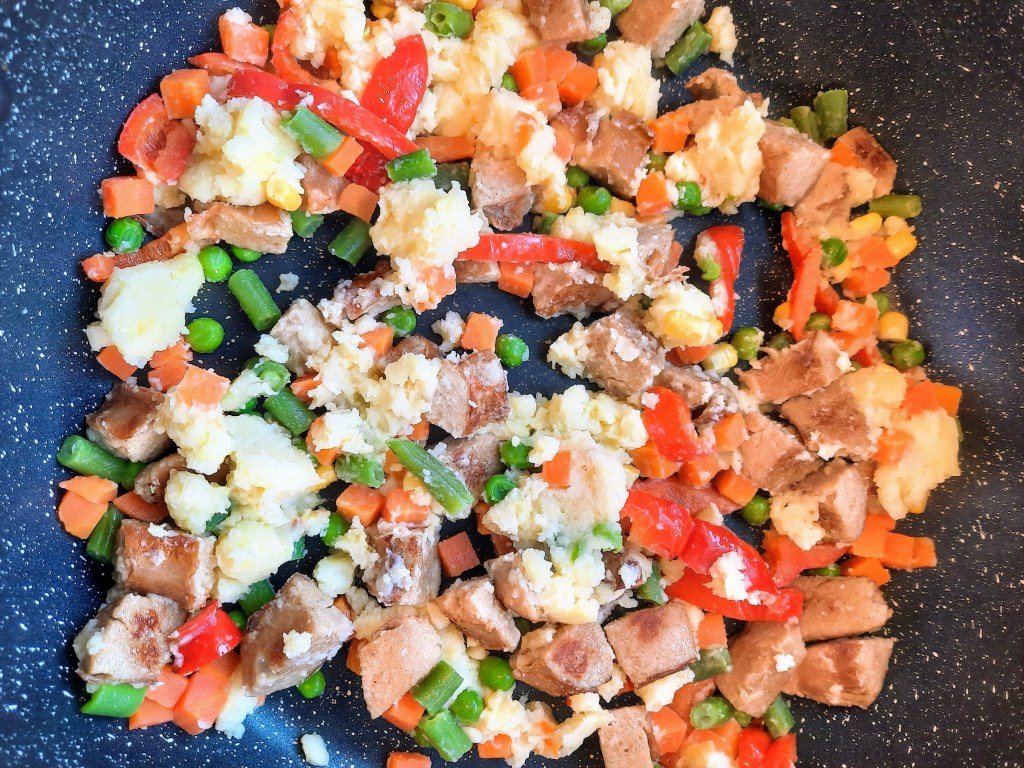 - Add the oil to a large frying pan and heat over medium-high heat.