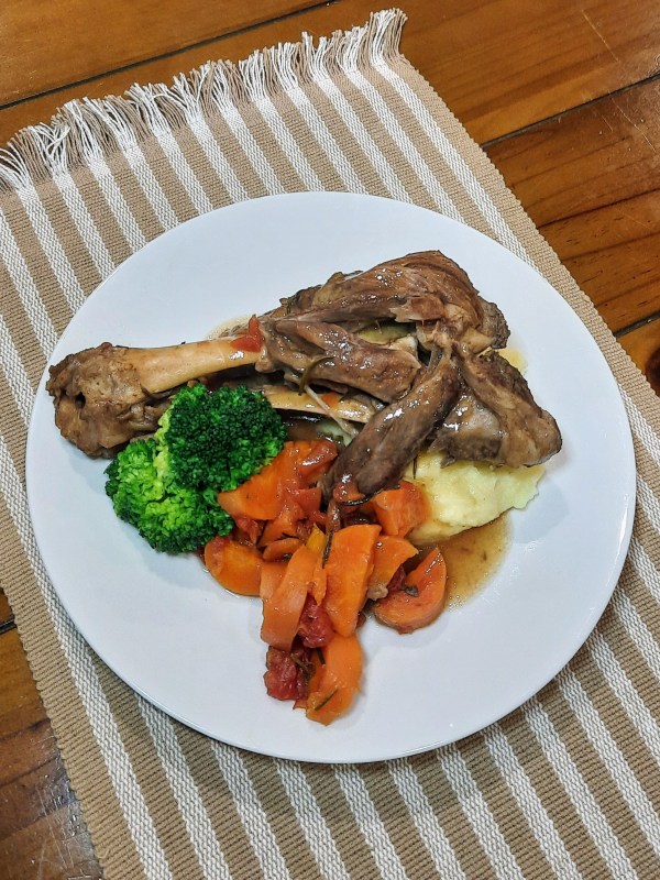 4. Once ready, serve the lamb shanks, the carrots cooked in the slow cooker, and the cooking juice as a jus.