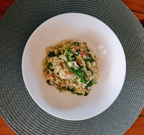 5. Once the chicken stock has been absorbed by the rice and it is cooked through (if it is not cooked through, add some additionally water and wait for absorbtion), remove from the heat.