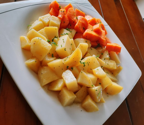 The carrots from the slow cooker, steamed green vegetables, and mashed potatoes.