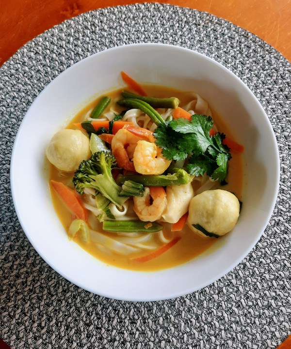 This laksa is not spicy – add some chilli oil or chilli flakes at the end if you like a bit of heat!