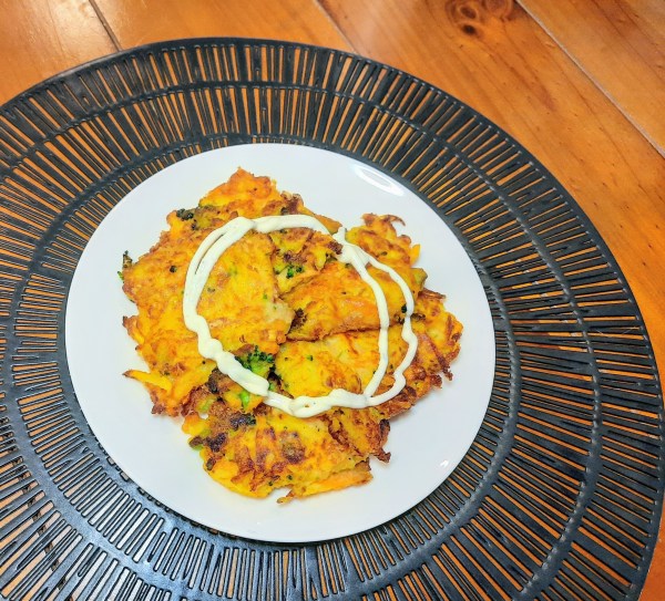 3. Add large spoonfuls of batter into the pan, and squish down, to make a fritter shape.